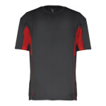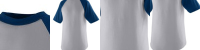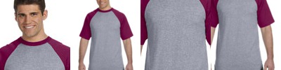 4.8 ounce 50% polyester/50% cotton jersey knit * Crew neck * Contrast color neck and sleeves * Raglan sleeves * Serged fishtail bottom