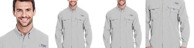 3 oz., 100% Tactel®; nylon taffeta Back Country Cloth; Quick-dry; Omni-Shade™; UPF 30 sun protection; Button-down collar; Roll-up sleeves with tab holders; Vented; Utility loop; Columbia PFG logo patch on rod holder on left chest.