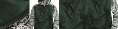 - Solid fleece body with charcoal fleck hood, drawcord and sleeves