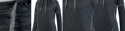 - Scuba shaped 3 piece hood with contrast color mesh lining and heathered tipped drawcord on sizes M-2XL only
