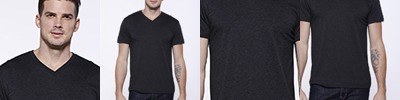 3.5 oz., 100% combed ringspun cotton; Heather Grey is 90% cotton, 10% polyester; 30 singles; Side seams; retail fit; Tear-away label; Deep v-neck; Classic fit; Made in a W.R.A.P. certified factory;