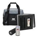 This special gift set features a 24 can capacity Cooler made of a rugged waterproof 500D Tarpaulin exterior. Leak-resistant heat-sealed liner. Includes a main zippered compartment, front zippered pocket, hook and loop secured handles and an adjustable/detachable padded shoulder strap and a stainless steel bottle opener. Measures 8" D x 14" W x 12.5" H.