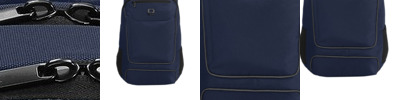 840D poly two-tone PU Spacious main compartment with organization panel Easy-access padded laptop/compartment with fleece-lined, brushed tricot tablet sleeve Interior organization pockets Dual side mesh beverage pockets Ergonomic adjustable air mesh shoulder straps Reflective piping on front, handle and shoulder straps for increased visibility Integrated webbing luggage trolley strap on back Dimensions: 19'h x 10.5'w (top) x 13.5'w (bottom) x 9.5'd Capacity: 1,464 cu. in./24 L Weight: 1 lb./1.2 kgs Laptop sleeve: 15'h x 11'w; fits most 17' laptops. Note: Bags not intended for use by children 12 and under.