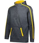 7.1 ounce 100% polyester tonal performance wicking fleece * 100% polyester performance wicking fleece solid contrast inserts and pocket welts * 3.35 ounce, 100% polyester mesh hood lining * Wicks moisture * Tagless label * Scuba shaped 3 piece hood with contrast color lightweight mesh lining and heathered tipped drawcord on Adult sizes only * Contract color sleeves stripes and front welt pockets * Raglan sleeves * Front pouch pocket * Self-fabric cuffs and bottom band
