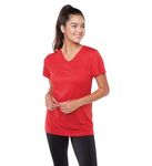 * 100% polyester wicking smooth knit with color secure(r) technology on front and back panels that helps prevent dye migration * 90% polyester/10% spandex wicking mesh back yoke and side inserts with color secure(r) technology that helps prevent dye migration* Wicks moisture * Odor resistant * Ladies' fit * Tag-free label * V-neck collar * Contrast color neck and piping