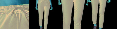 * 12 ounce per linear yard, 100% polyester stretch double knit * "R RUSSELL" back left hip" * Branded silicone knitted elastic waistband with tunnel belt loops * Two-snap closure * Zipper fly * Two set-in double welt back pockets with button closure * Reinforced knees * Elastic cuffs