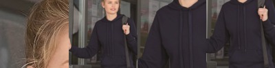 - Coverstitched neck, shoulders, armholes, cuffs, hood, pocket and bottom band